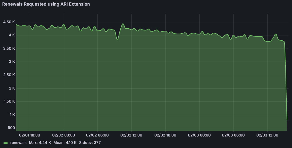 Since enabling the use of the ARI extension, our certificate management system has become significantly more robust. Shopify now delegates the responsibility of determining renewal timing to Let’s Encrypt. The ARI extension has proven to be an impactful infrastructure improvement and the benefits gained are immediate. These benefits, alongside fewer manual interventions, are the operational success story: